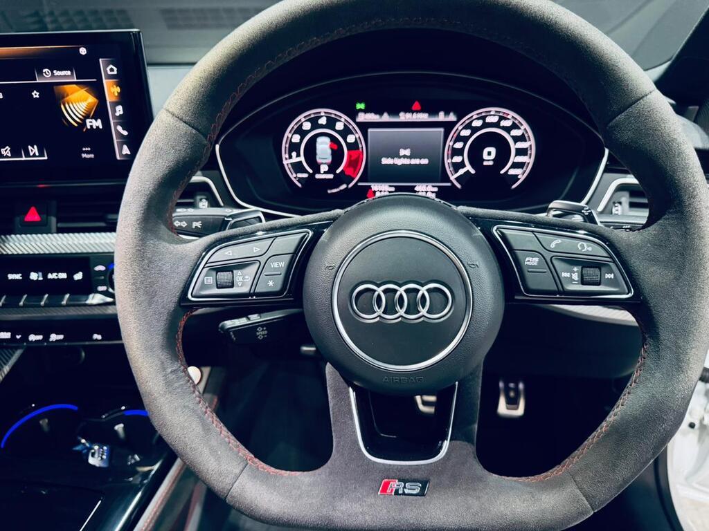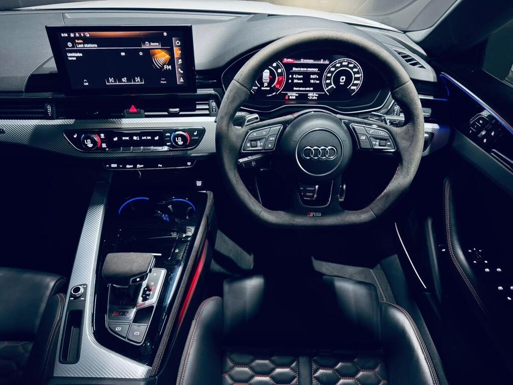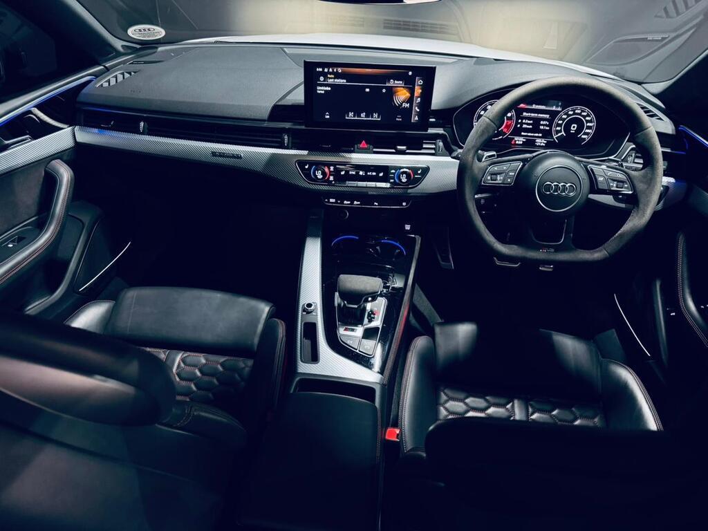 , Black headliner, Split-folding rear seats, Audi Virtual Cockpit (Digital Instrument Cluster), RS performance displays (G-force, torque, lap timer), Bang & Olufsen Premium Sound System, Audi MMI Navigation Plus, Bluetooth connectivity, Apple CarPlay & Android Auto, Voice control, Multi-function steering wheel controls, Audi Pre-Sense Front, Multiple airbags, ABS & ESP, ISOFIX child seat anchors, Tyre pressure monitoring system, Head-up Display, Massage Seats.
