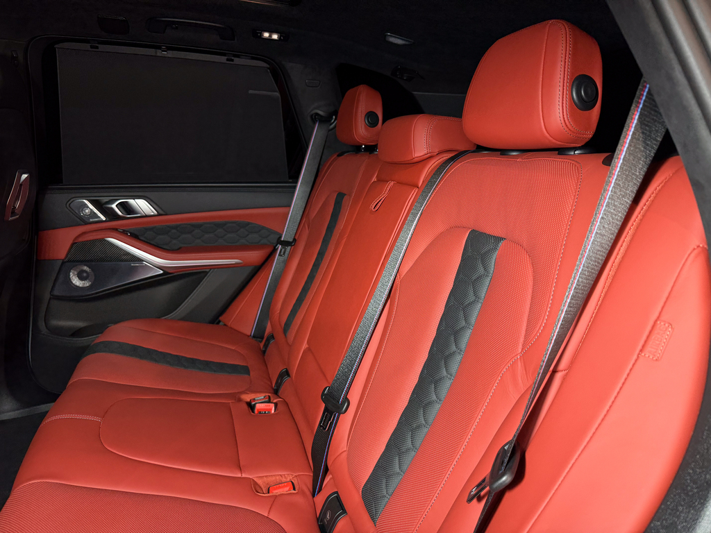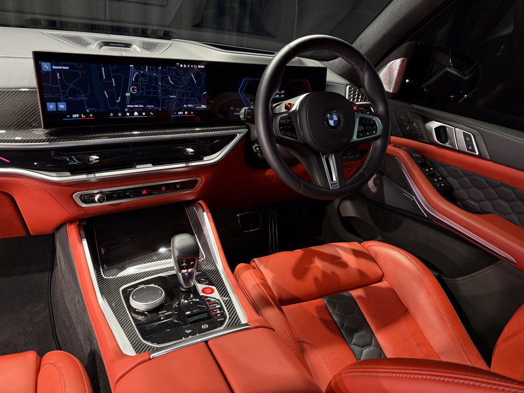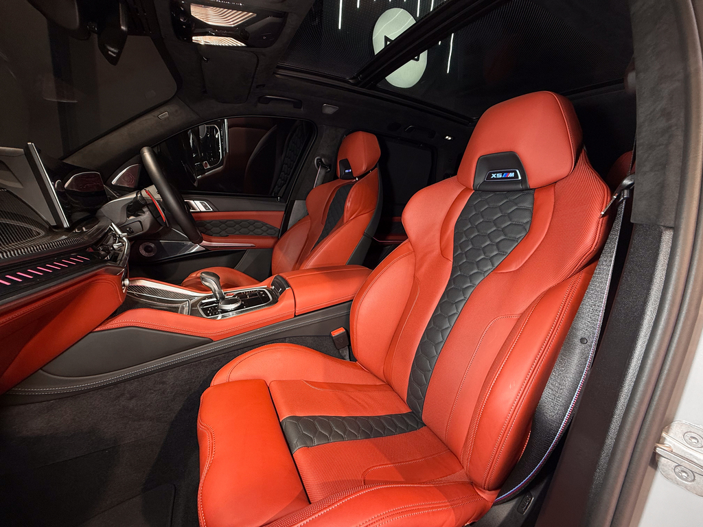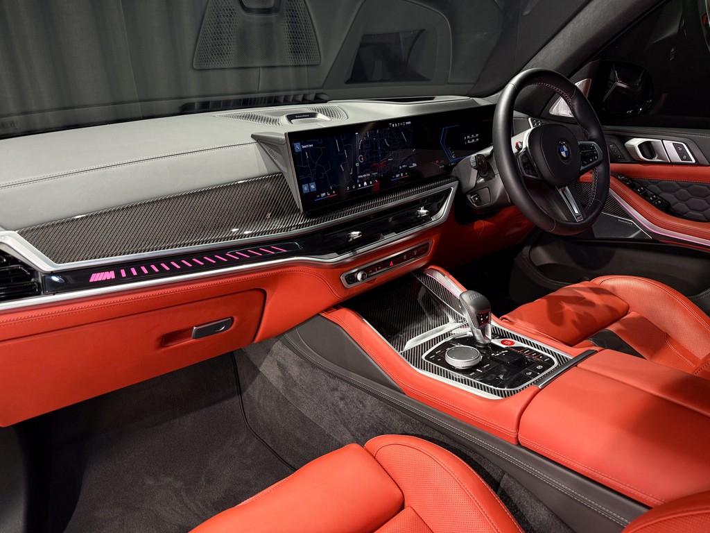 M Driver's Package (Increased top speed), Comfort Package, Refrigerant, Roof lining Alcantara anthracite, Bowers & Wilkins Diamond surround sound system, Interior trim finishers Carbon Fibre, Heat Comfort package (front), Seat heating front and rear, M seat belts, Active seat ventilation(front), Cupholderwith temperature control, Panorama glass roof Sky Lounge, BMW Individual Lights Shadow Line, M carbon mirror caps, M Compound brake, red high-gloss, Trailer tow hitch - fully electrically operated, Soft close automatic system for doors, 21"/22" Star-spoke styling 818 M, Jet Black. Front: 295/35 R21; Rear: 315/30 R22, Full leather Merino Sakhir Orange, BMW Gesture Control, BMW Live Cockpit Professional, Storage for wireless charging, Parking Assist Professional, Driving Assist Professional, High Beam Assist, Adaptive LED headlights, Ambient Air Package, Automatic air conditioning with 4-zone control, M Multifunctional seats for driver and front passenger (Incl. SA488), Travel & Comfort System, Seat adjustment - electric with memory for driver's seat, Roller Sun Blind For Rear Side Windows(mechanical), BMW Individual roof rails high-gloss Shadow Line, Comfort Access, Tyre Pressure Monitoring.