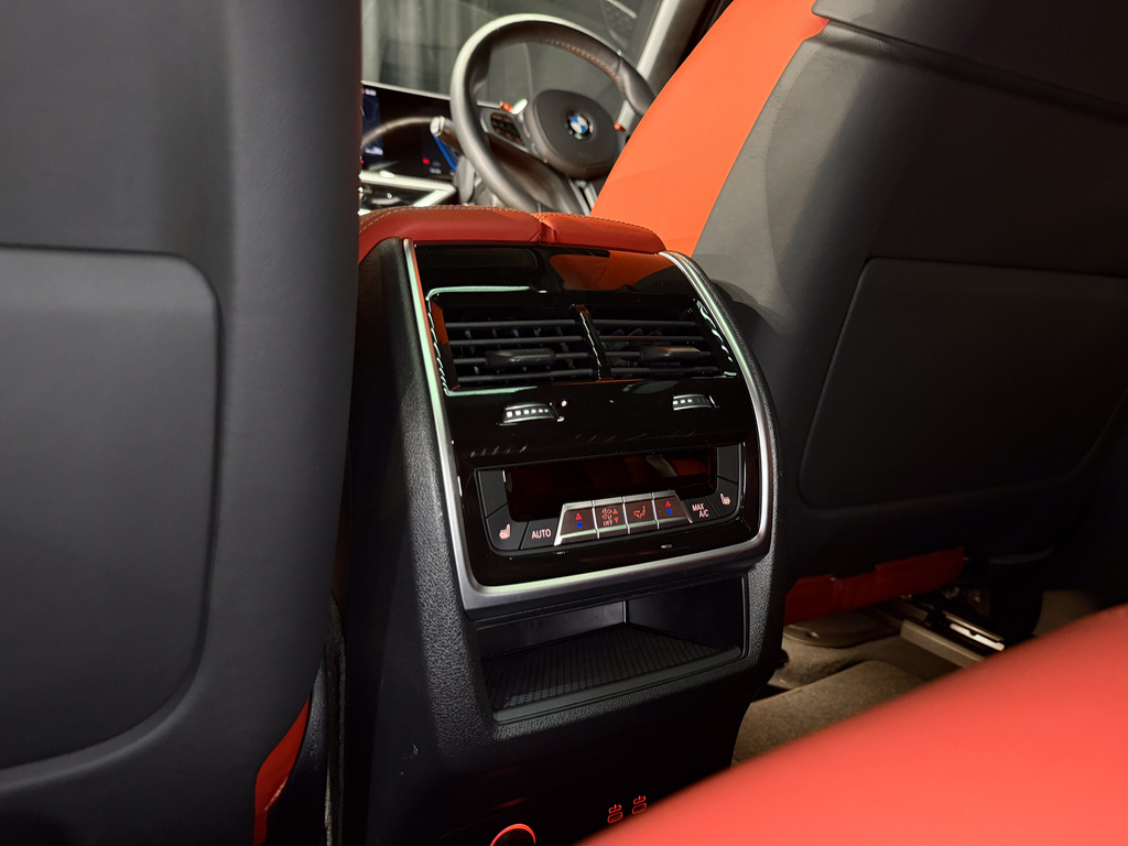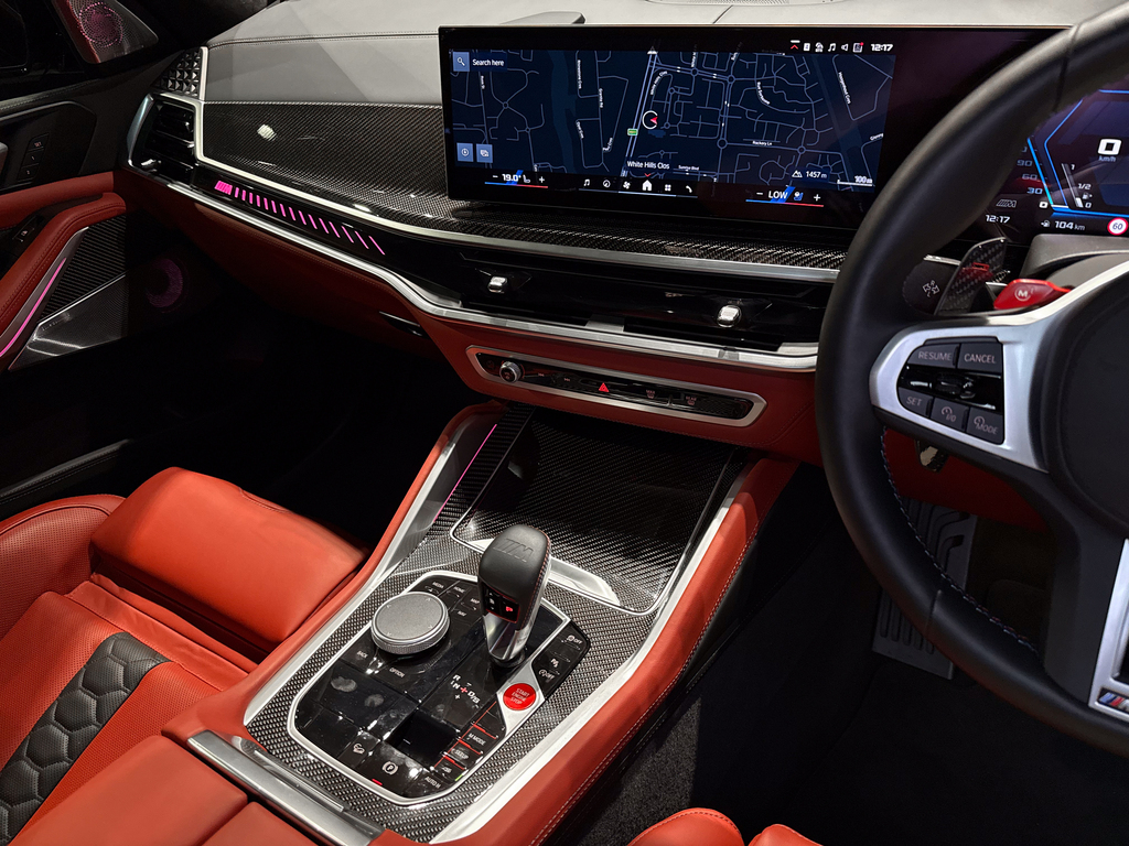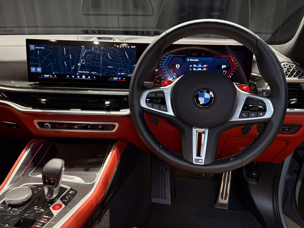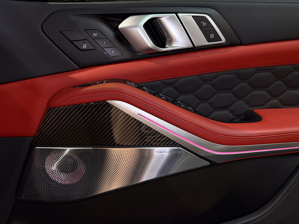 M Driver's Package (Increased top speed), Comfort Package, Refrigerant, Roof lining Alcantara anthracite, Bowers & Wilkins Diamond surround sound system, Interior trim finishers Carbon Fibre, Heat Comfort package (front), Seat heating front and rear, M seat belts, Active seat ventilation(front), Cupholderwith temperature control, Panorama glass roof Sky Lounge, BMW Individual Lights Shadow Line, M carbon mirror caps, M Compound brake, red high-gloss, Trailer tow hitch - fully electrically operated, Soft close automatic system for doors, 21"/22" Star-spoke styling 818 M, Jet Black. Front: 295/35 R21; Rear: 315/30 R22, Full leather Merino Sakhir Orange, BMW Gesture Control, BMW Live Cockpit Professional, Storage for wireless charging, Parking Assist Professional, Driving Assist Professional, High Beam Assist, Adaptive LED headlights, Ambient Air Package, Automatic air conditioning with 4-zone control, M Multifunctional seats for driver and front passenger (Incl. SA488), Travel & Comfort System, Seat adjustment - electric with memory for driver's seat, Roller Sun Blind For Rear Side Windows(mechanical), BMW Individual roof rails high-gloss Shadow Line, Comfort Access, Tyre Pressure Monitoring.