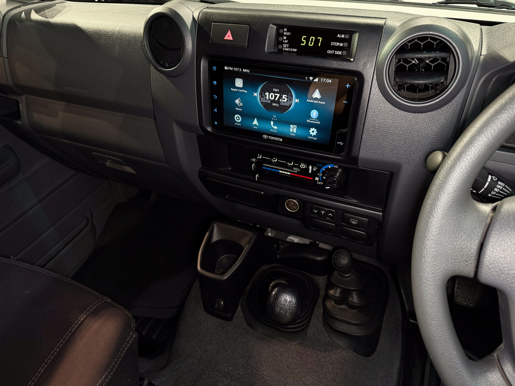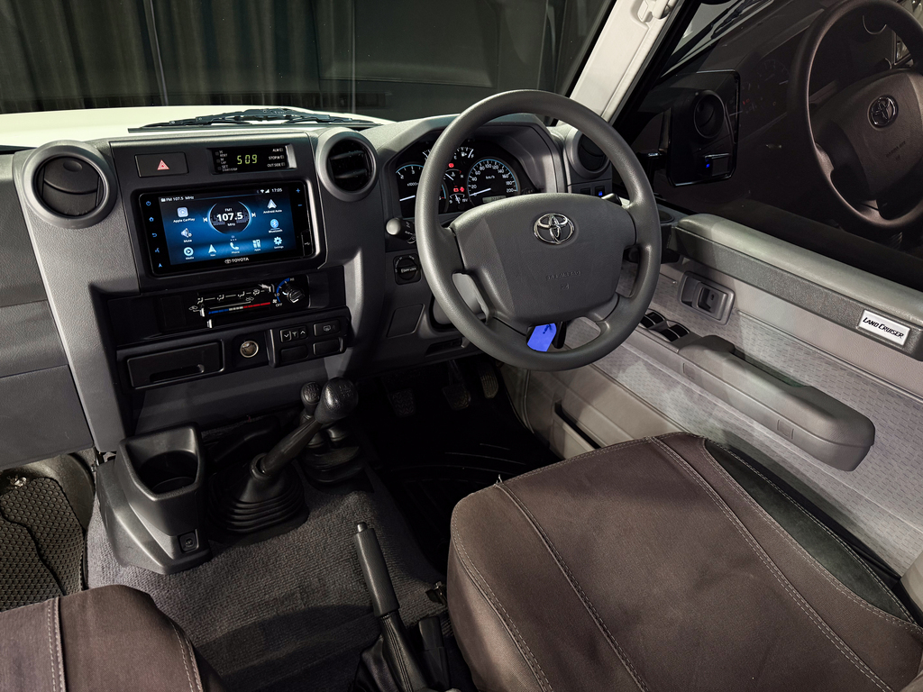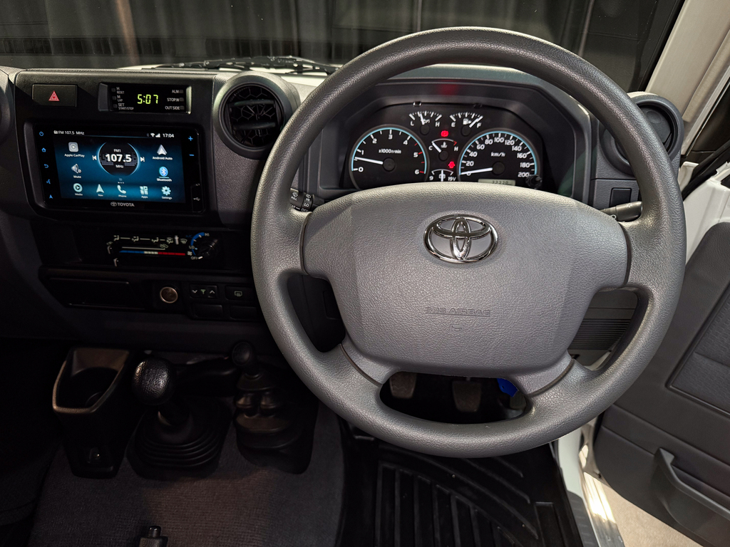 4.5 V8 Turbo Diesel, Manual Transmission, 4x4 Drivetrain (2H/4H/N/4L), Air Conditioning, Bluetooth Connectivity, Digital IVN Audio/Visual System (Toyota Branded), Leather Gear Knob, Heavy-Duty Seat Covers (Front & Rear with Storage Pockets), Rubber Mats (Full Set + Load Area), Door Top Storage Compartments, Centre Storage Console (No Fridge), Differential Lock, Snorkel, Bull Bar with Dual LED Spotlights, Additional Spotlights, Factory Side Steps, Rear Grab Handles, Tow Bar, Tow Hook, Rear-Mounted Spare Wheel, 1kg Fire Extinguisher, Jack & Tools Included, Single Fuel Tank, Roof Standard, Full Service Books & Owner’s Manual Included.